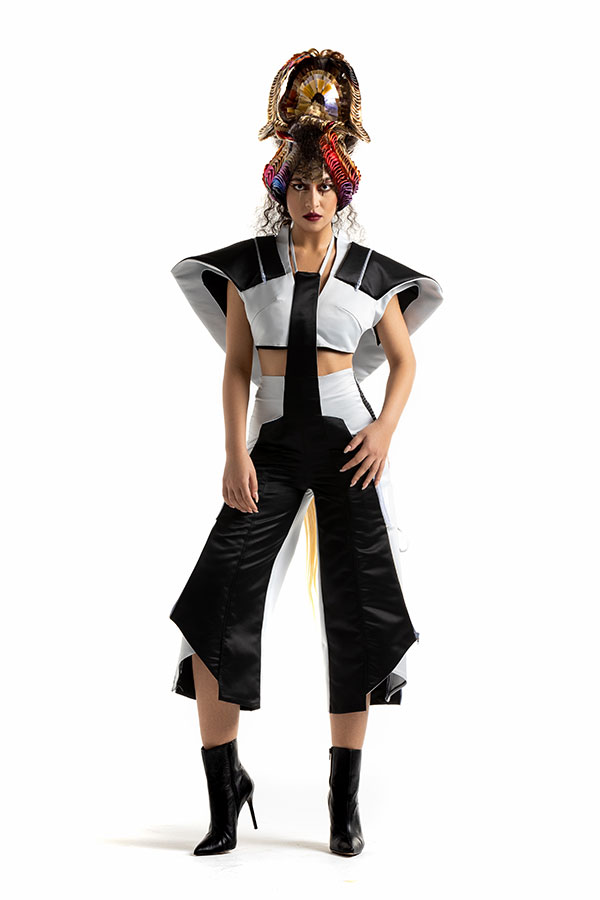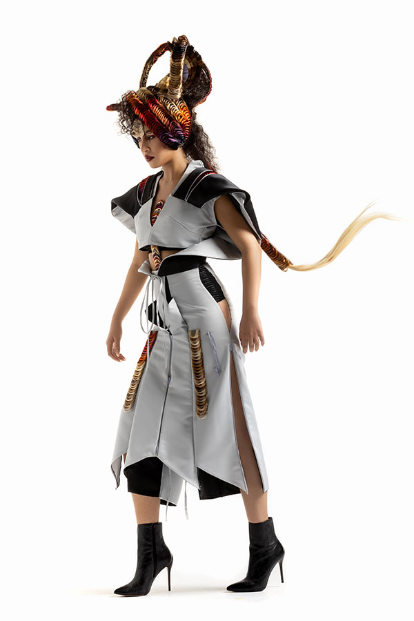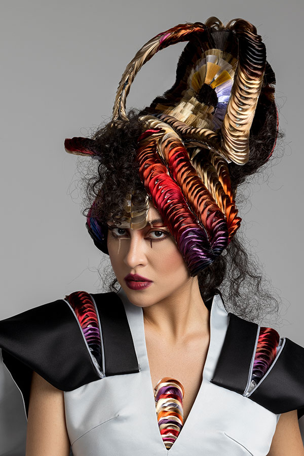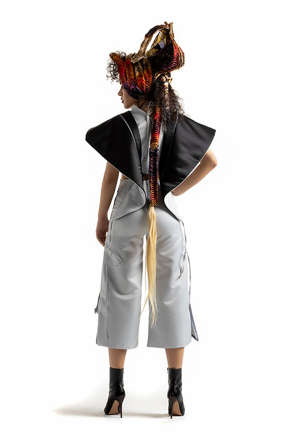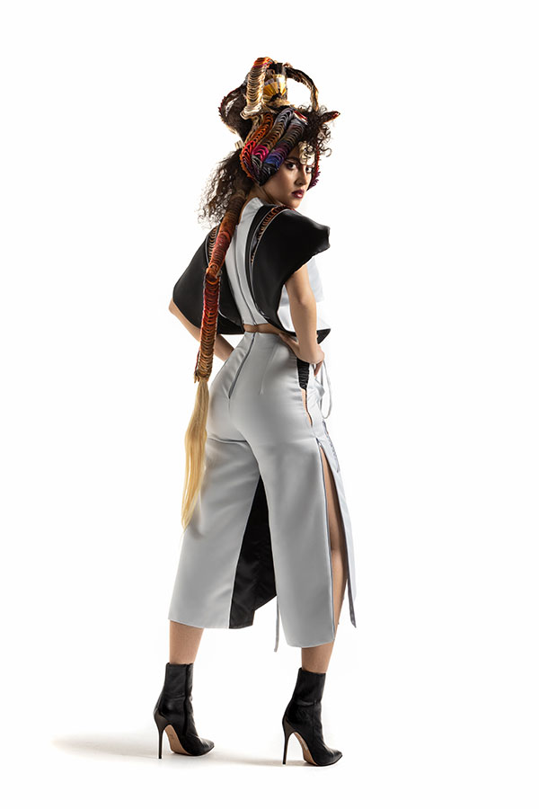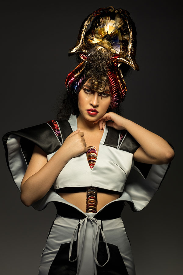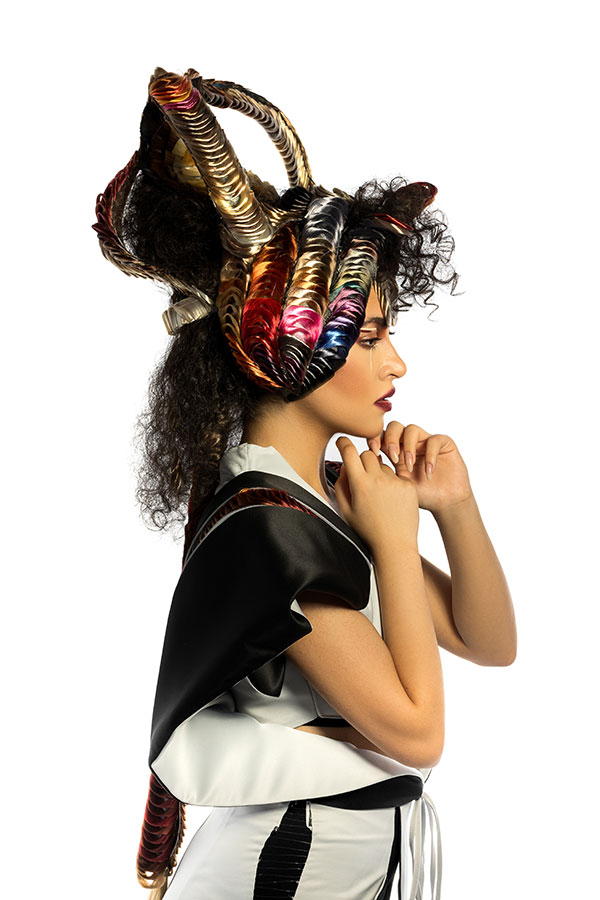 The collection explores dimension through different proposals. To do this, it creates a play of colors with small multidimensional headdresses, the effect of which is also used in garments.