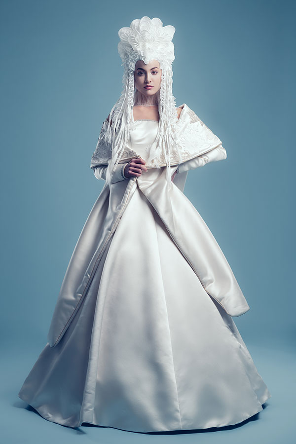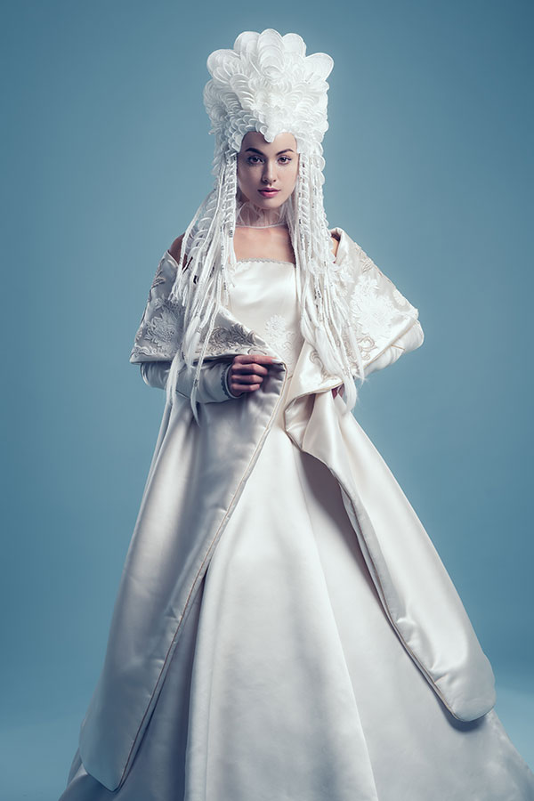 This woman has learned what is the beauty of love and then the pain. Now, she finally takes another step in her life and the new moon marks a new beginning. Hence the wedding gown is pure white, a color associated with holiness and purity. Although it is a color in which the most sophisticated techniques are blurred, Ryuta Tomono has boldly incorporated the most intricate techniques into this design. Except for the silver hair cuffs, this look is made entirely of hair. All the bases on which the hairpieces are placed are made up of more than 500 strands of braided hair. The sheets of white hair have been carefully designed down to the smallest detail and all the edges have been braided to give them stability. Nearly 300 hairpieces, in different shapes, were architecturally placed to create an organic form.