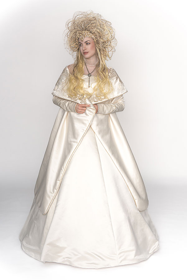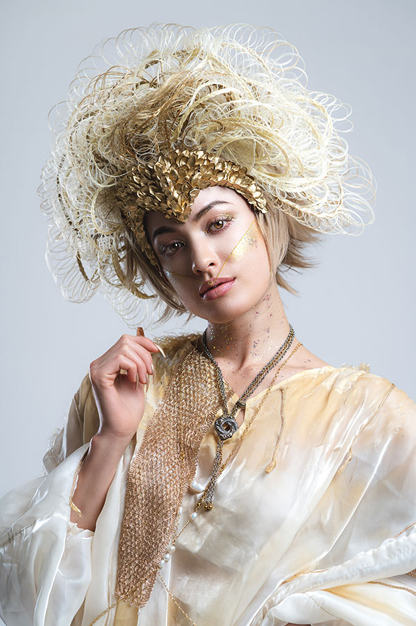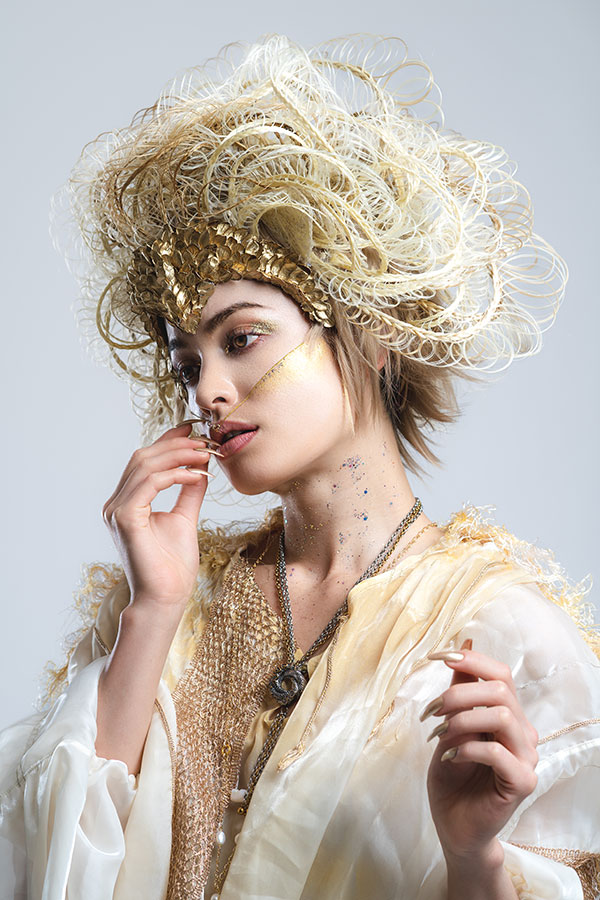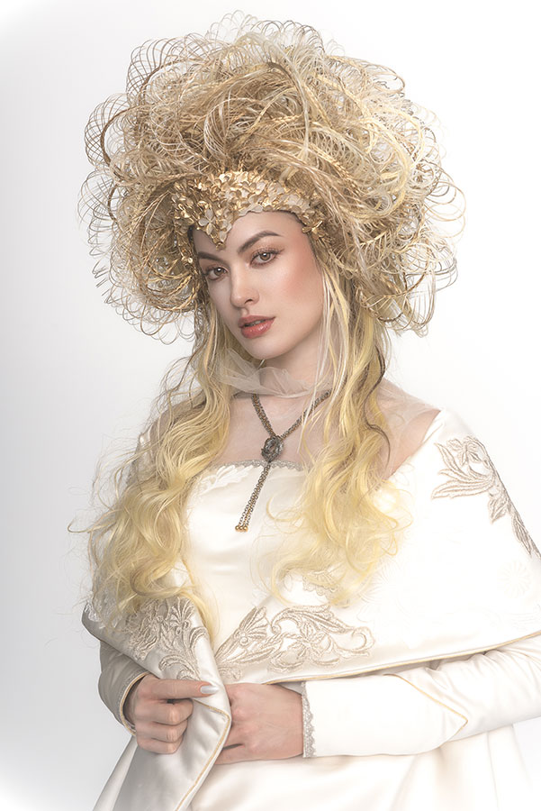 The wedding day has finally arrived. Evolving from her first love, she has learned what is the beauty and the pain of love. After all, she is now determined to embark on her new journey. She now knows that her wedding is not a 'happy ending', but a 'new journey' in her life. At that moment, on that special day, she feels at the peak of her life. This look was not initially part of the collection, originally planned as a two-day shoot, where Ryuta would re-shoot the best styles from each stage on the second day in an attempt to perfect them. However, the inspiration for 'Across the Stars' came to him on the day of the first shoot and he immediately started working on it at night, for 12 hours straight, to transform 'First Love' into this final design. The base of her hair was changed to long blonde hair, and all the front petals were removed and reattached. About 50 fine braids were added, and the 'First Love', which was conceived as the image of purity, was reborn in one night as a magnificent wedding gown.