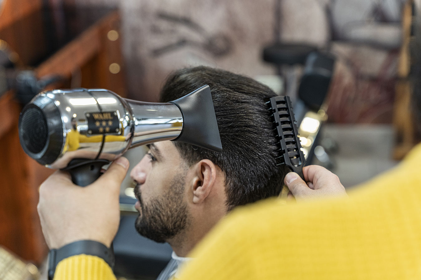 The elegant effect of the Brush Back Look can only be achieved with expert know-how and maximum precision. That is why the use of the correct tools is so important. Only the most powerful and precise professional appliances are capable of providing perfect results. To create this look, professionals tend to choose the BERET STEALTH in addition to WAHL’s cult CORDLESS SUPER TAPER appliance. Both are currently available as a limited edition cordless combo with an elegant black design. Also used is the WAHL BARBER DRYER.