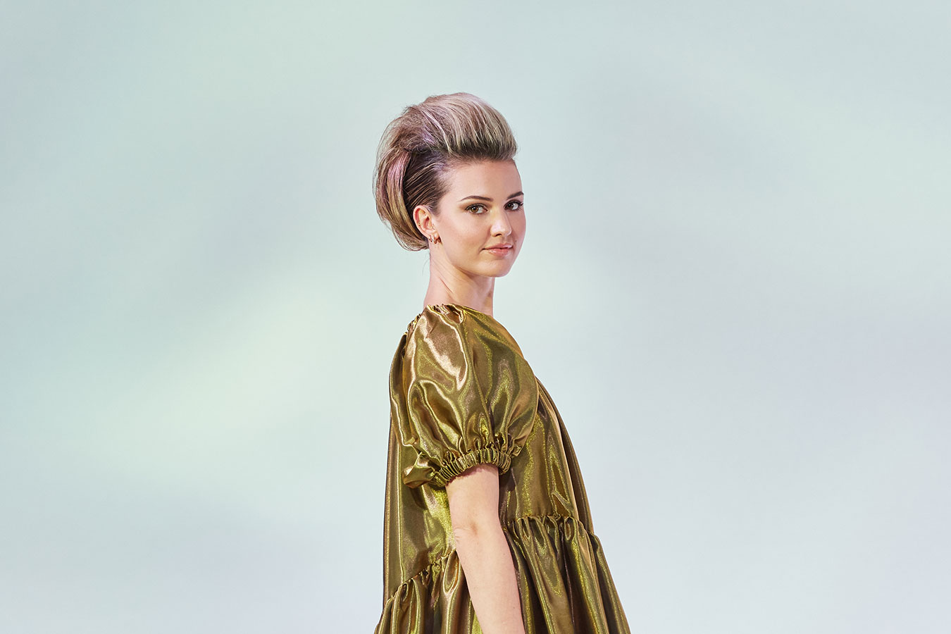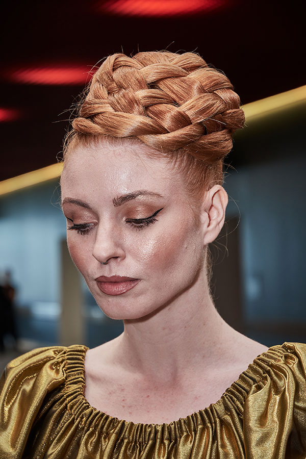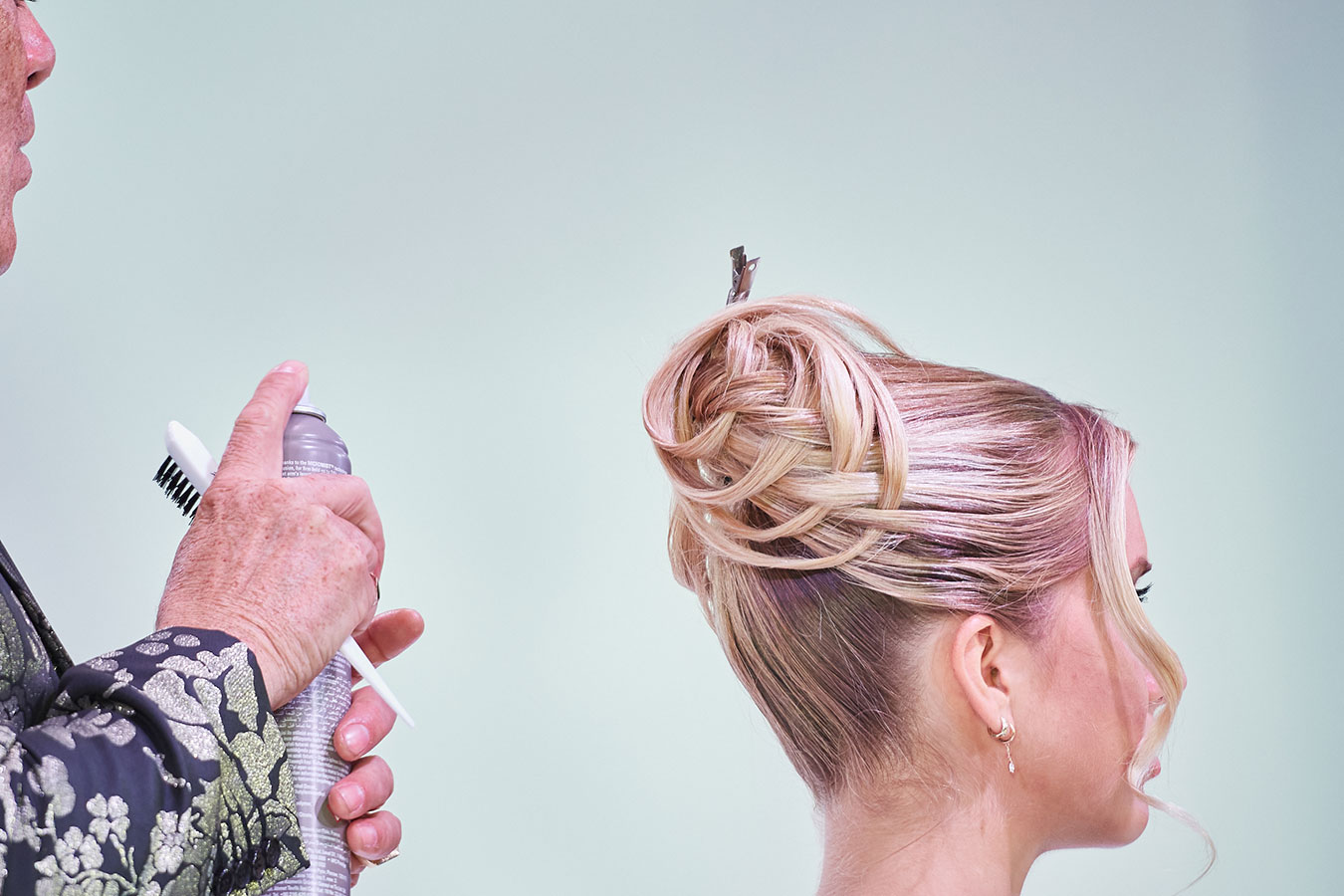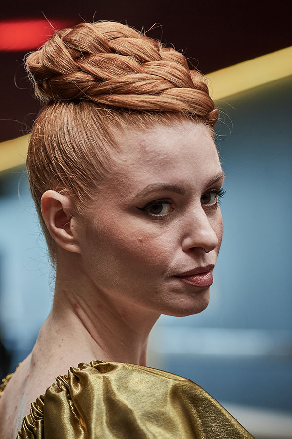 Patrick breezed through an inspirational collection of hair up looks, encompassing techniques including knotting, weaving, and even twisting the hair through a classic, retro Topsy Tail tool. “I love playing,” he said. “And just seeing how the hair sits. That’s what inspires my creativity. Don’t overthink it – straightaway that’s what makes it old fashioned.”