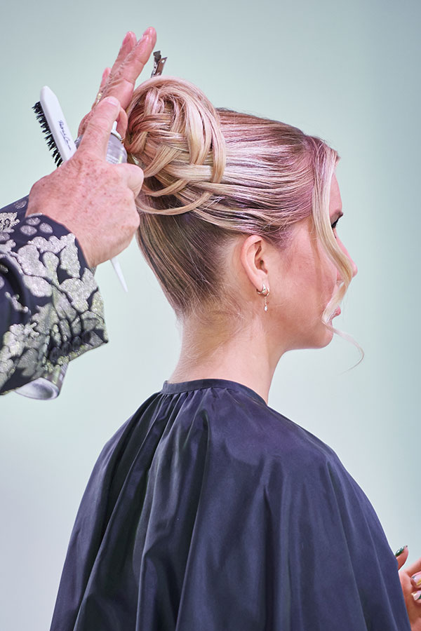 Reiterating the importance of a strong foundation, especially for softer looks, Patrick shared tips for building the perfect base: don’t over-condition the hair to maintain some grip, and always use hot rollers or a classic tong set to prep. He also shared the importance of model choice for photographic work on social media, explaining how intricate looks often work best on lighter hair to showcase the detailing, while darker hair can perform better for more structural styles.