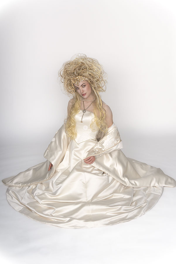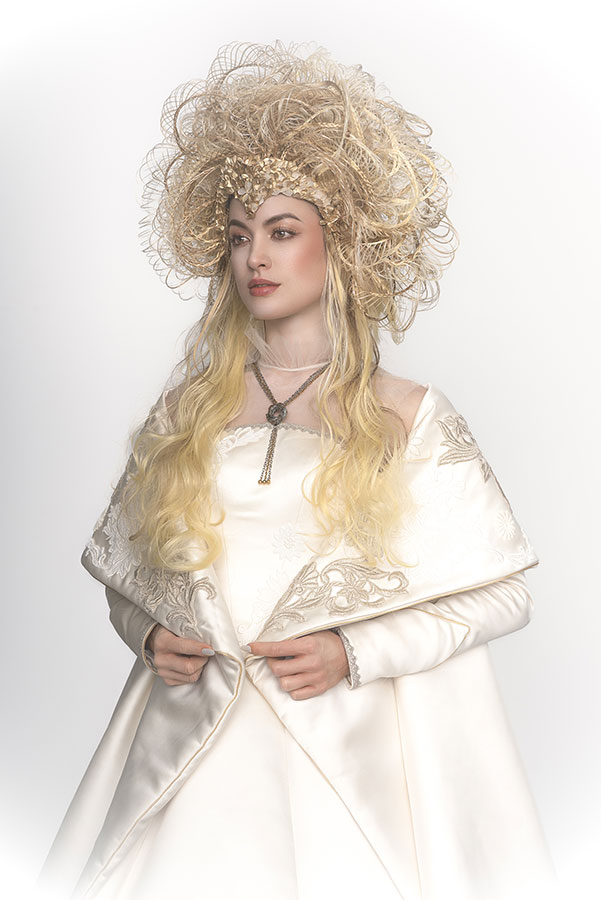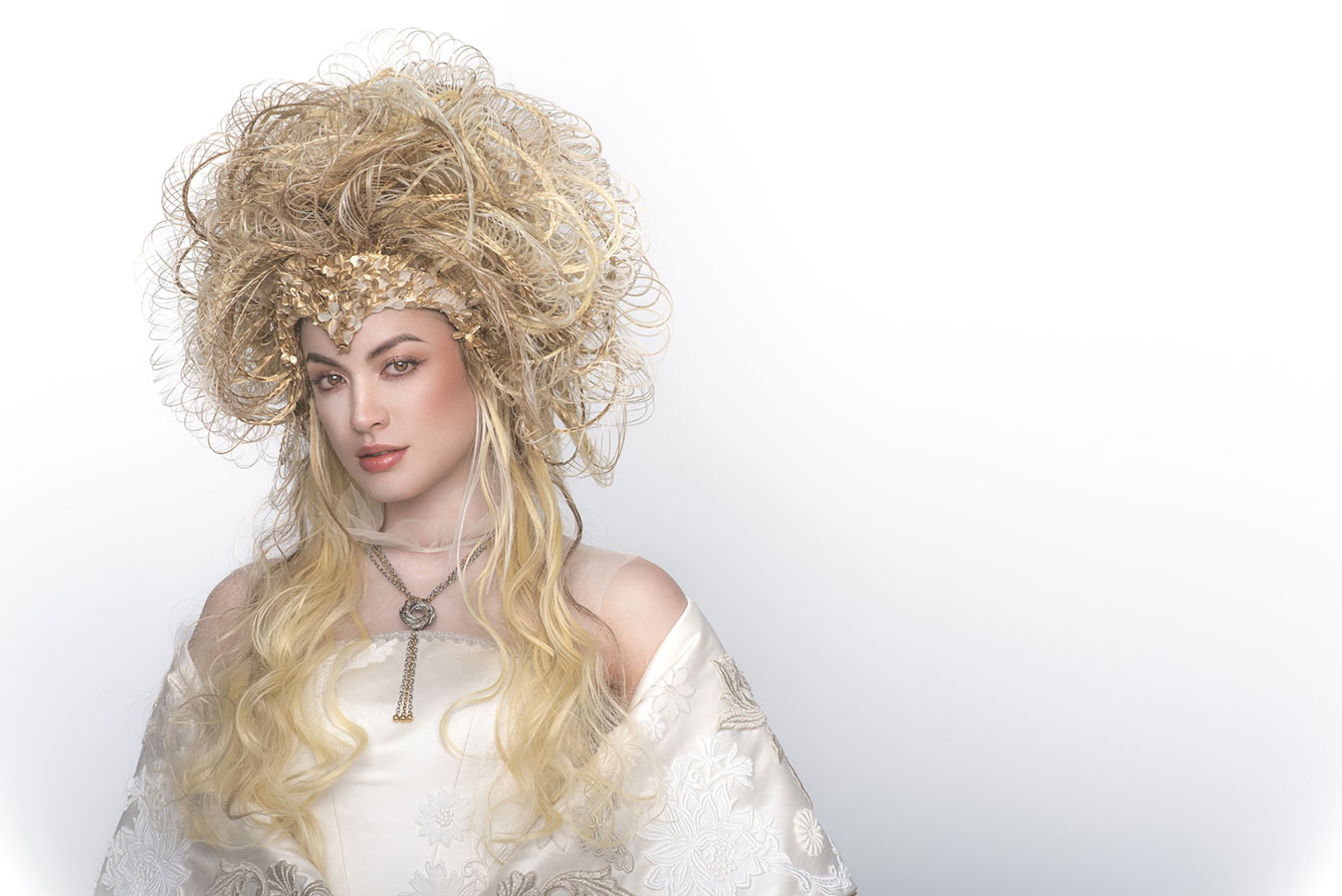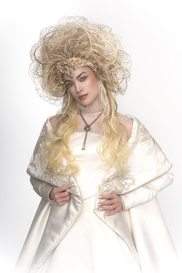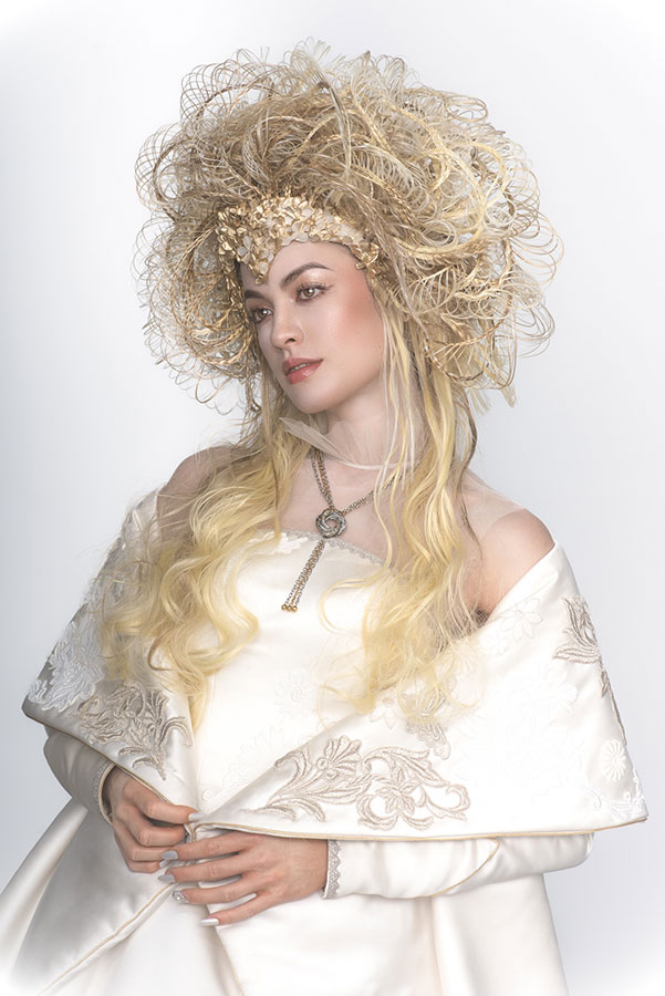 The wedding day has finally arrived. Evolving from her first love, she has learned what is the beauty and the pain of love. After all, she is now determined to embark on her new journey. She now knows that her wedding is not a 'happy ending', but a 'new journey' in her life. At that moment, on that special day, she feels at the peak of her life. This look was not initially part of the collection, originally planned as a two-day shoot, where Ryuta would re-shoot the best styles from each stage on the second day in an attempt to perfect them. However, the inspiration for 'Across the Stars' came to him on the day of the first shoot and he immediately started working on it at night, for 12 hours straight, to transform 'First Love' into this final design. The base of her hair was changed to long blonde hair, and all the front petals were removed and reattached. About 50 fine braids were added, and the 'First Love', which was conceived as the image of purity, was reborn in one night as a magnificent wedding gown.