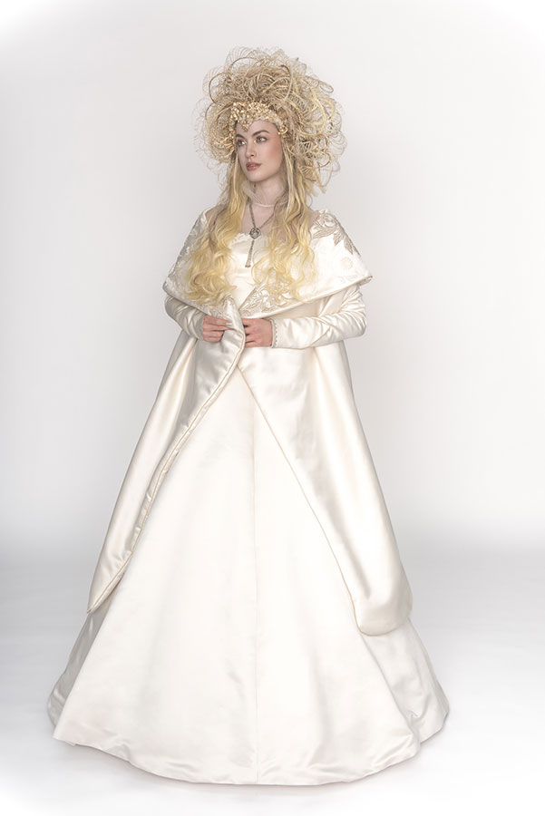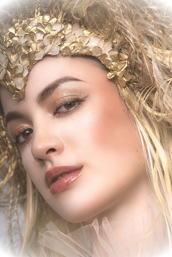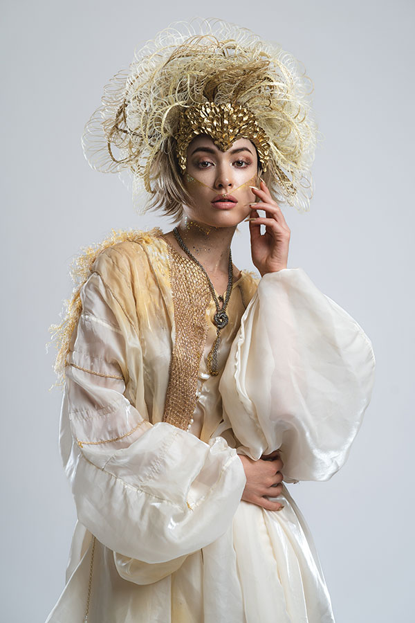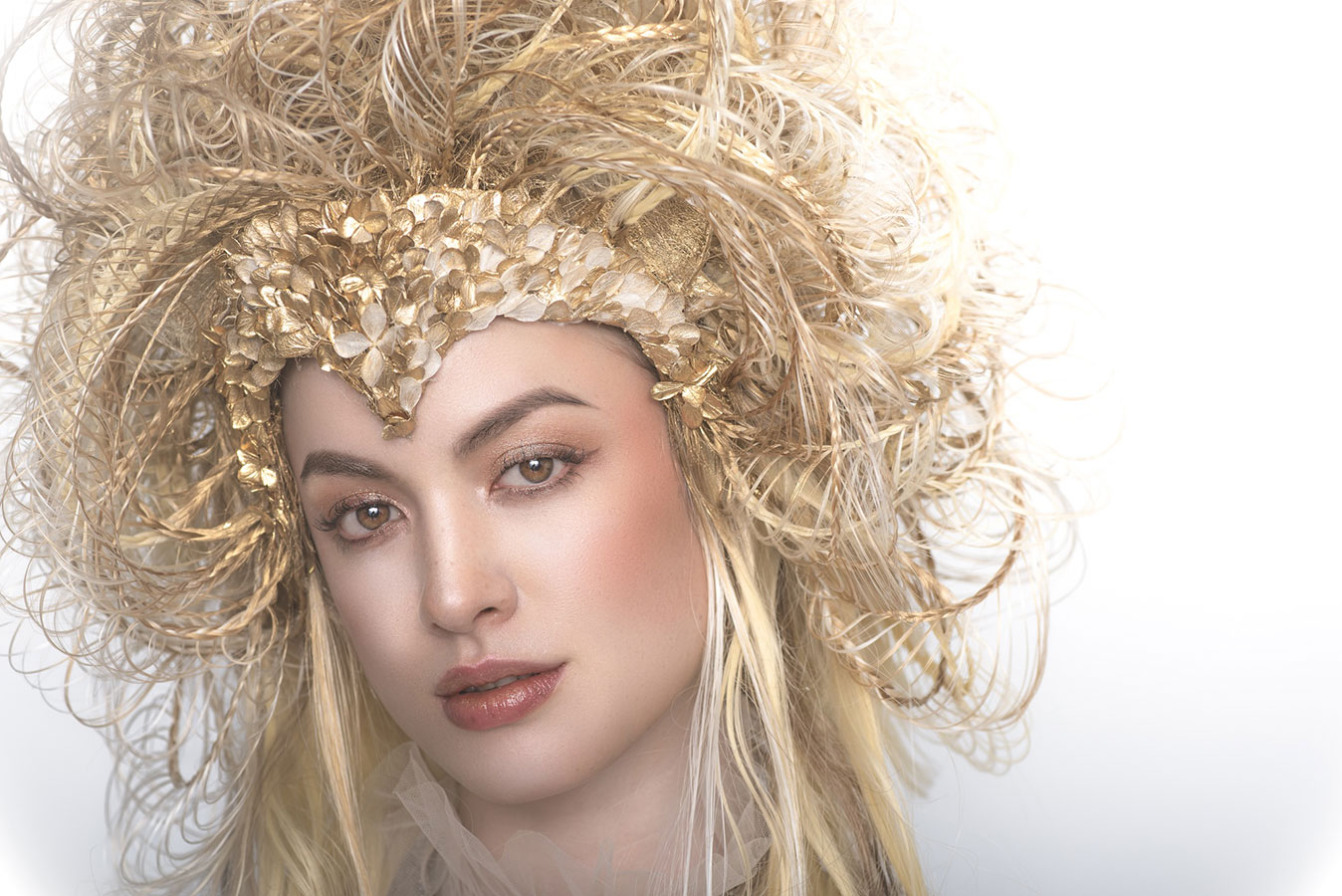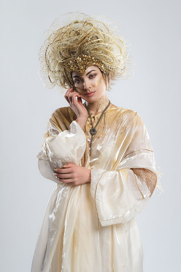 The wedding day has finally arrived. Evolving from her first love, she has learned what is the beauty and the pain of love. After all, she is now determined to embark on her new journey. She now knows that her wedding is not a 'happy ending', but a 'new journey' in her life. At that moment, on that special day, she feels at the peak of her life. This look was not initially part of the collection, originally planned as a two-day shoot, where Ryuta would re-shoot the best styles from each stage on the second day in an attempt to perfect them. However, the inspiration for 'Across the Stars' came to him on the day of the first shoot and he immediately started working on it at night, for 12 hours straight, to transform 'First Love' into this final design. The base of her hair was changed to long blonde hair, and all the front petals were removed and reattached. About 50 fine braids were added, and the 'First Love', which was conceived as the image of purity, was reborn in one night as a magnificent wedding gown.