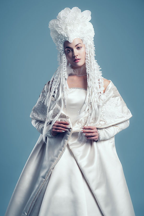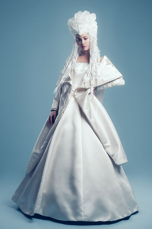 This woman has learned what is the beauty of love and then the pain. Now, she finally takes another step in her life and the new moon marks a new beginning. Hence the wedding gown is pure white, a color associated with holiness and purity. Although it is a color in which the most sophisticated techniques are blurred, Ryuta Tomono has boldly incorporated the most intricate techniques into this design. Except for the silver hair cuffs, this look is made entirely of hair. All the bases on which the hairpieces are placed are made up of more than 500 strands of braided hair. The sheets of white hair have been carefully designed down to the smallest detail and all the edges have been braided to give them stability. Nearly 300 hairpieces, in different shapes, were architecturally placed to create an organic form.