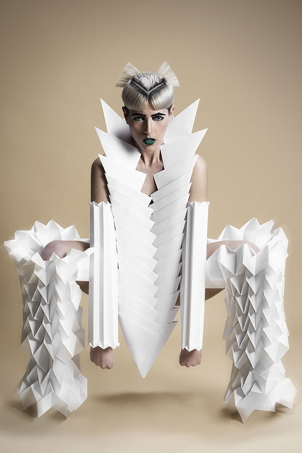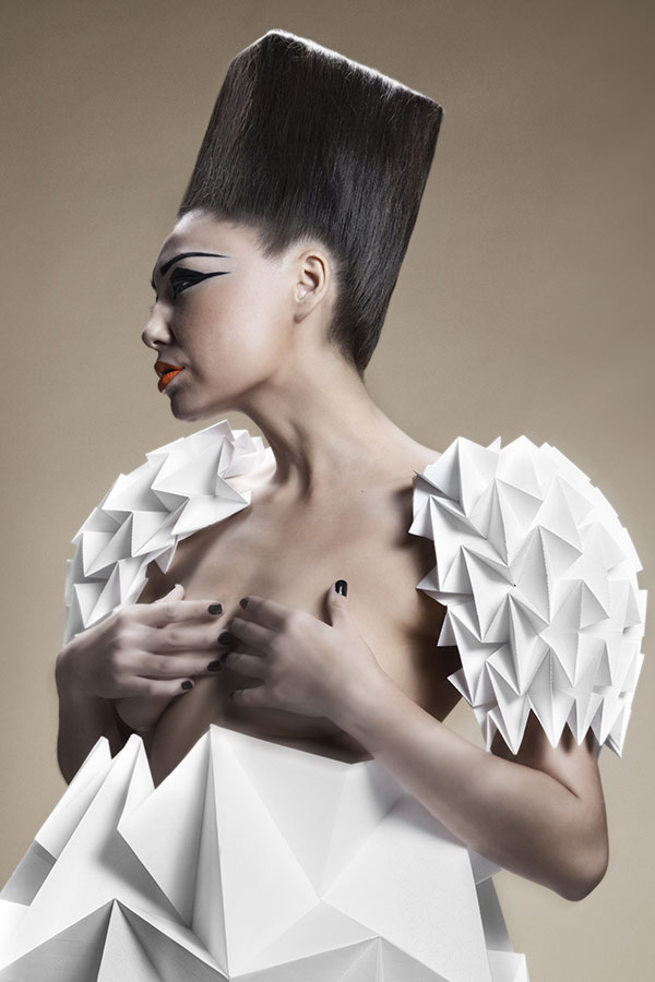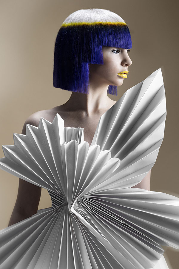 In this collection, the geometric shapes and lines inherent to this style are translated to the hair: straight and polished cuts, zig-zag, cubic formats, straight and precise lines, always taking care of the styling to create a complete image.
