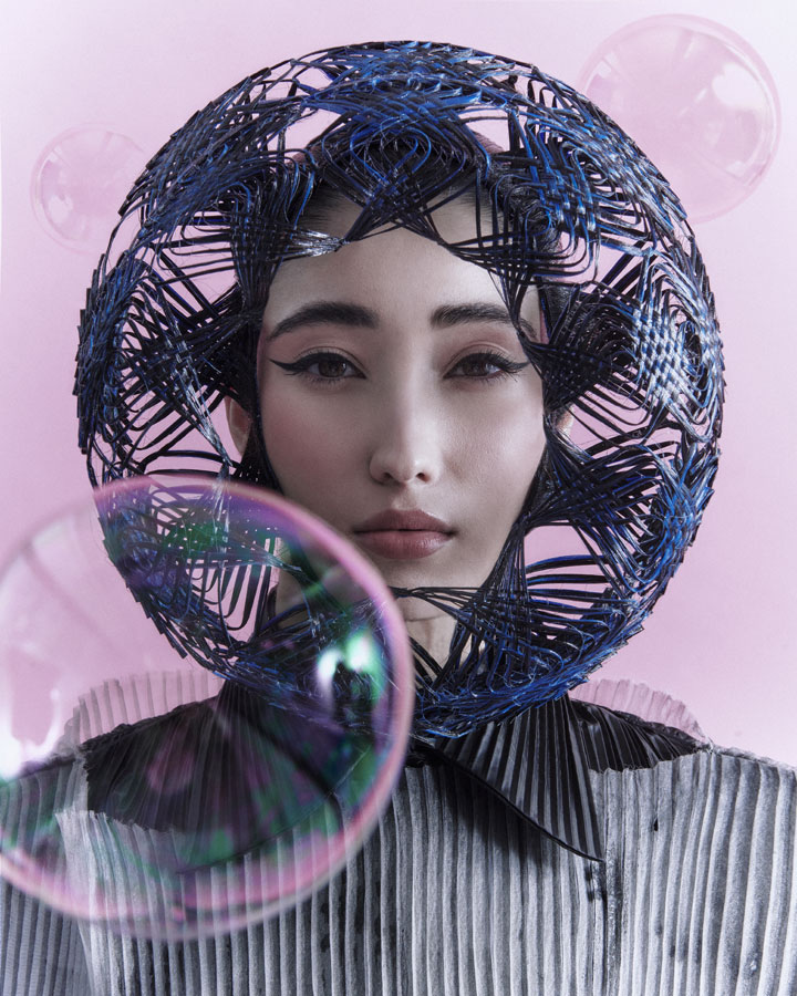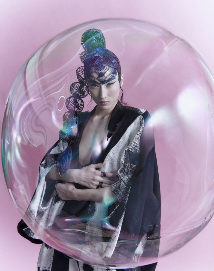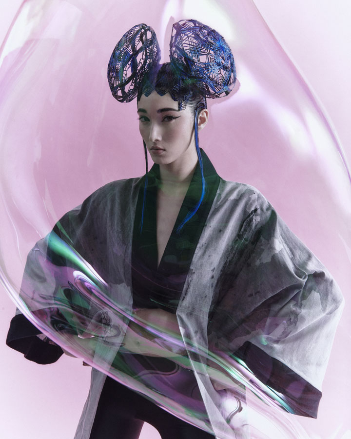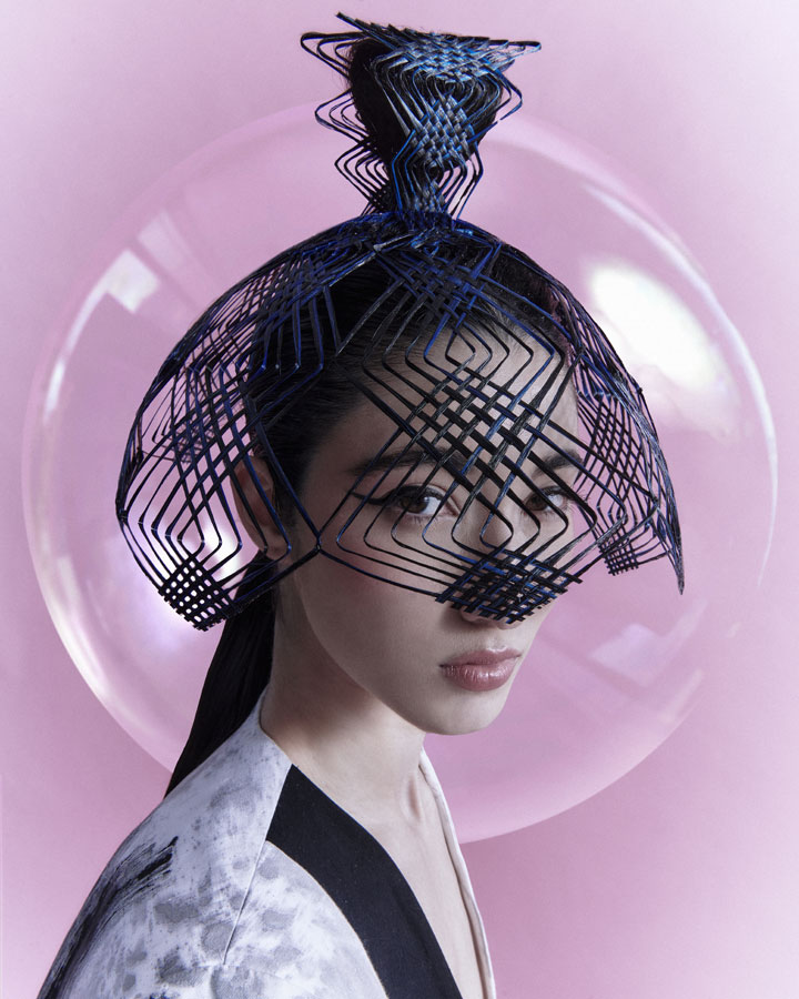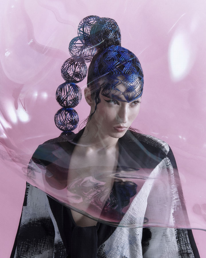 Is characterised by its elaborate structure based on the firm's renowned artisanal technique, which has been given a more three-dimensional and aerial character with wefts and interweaving without fastening. The creation process is completed with the interpretation of the typical ornaments of the numerous nihongami styles on the same hair and with the same techniques.