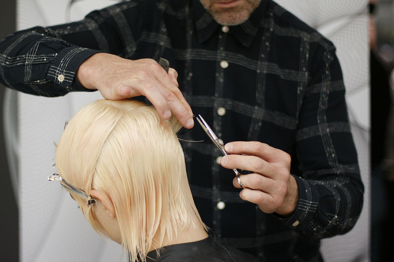 13. Subsequent sections are taken parallel to the first and continue working to the corner of the head, before being over directed back to retain length behind the ear.