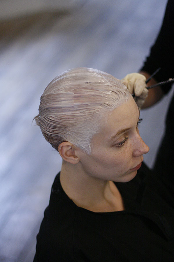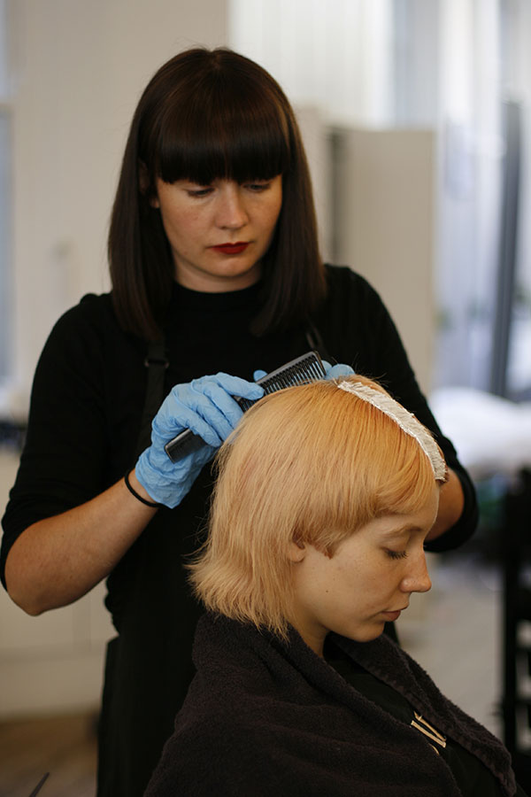 6. The hair is combed off the face in sections, with colour applied at the roots.