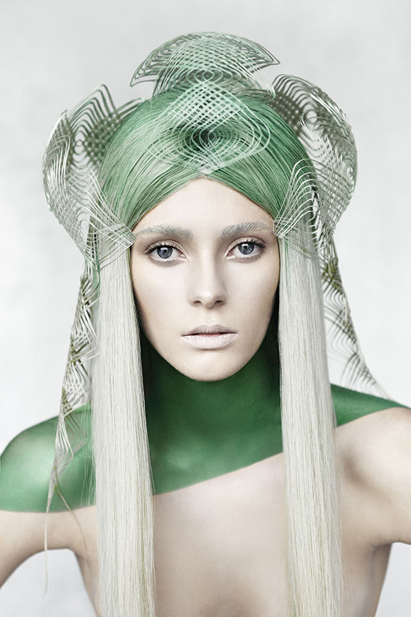 The collection explores the process by which fashion, at its most innovative extreme, invades the mind and creates trends. Each look combines neatness and harmony in forms, illogical and unreal, held in the limbo of the ethereal. Everything is executed with an artisan meticulousness that develops new manual, laborious and ancient techniques that take on new expression as innovation and infinite fashion. The hair strands are subtly woven in colors that flow naturally to the body, uniting the two into a conceptual, irreverent and contemporary whole.