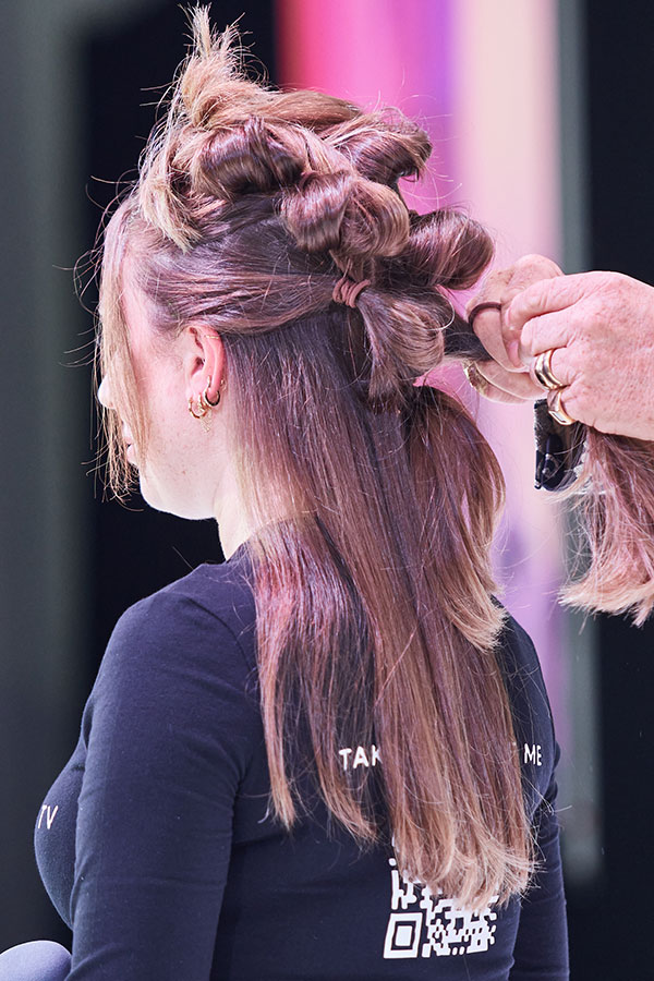 Patrick breezed through an inspirational collection of hair up looks, encompassing techniques including knotting, weaving, and even twisting the hair through a classic, retro Topsy Tail tool. “I love playing,” he said. “And just seeing how the hair sits. That’s what inspires my creativity. Don’t overthink it – straightaway that’s what makes it old fashioned.”