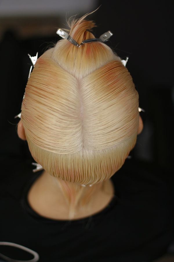 6. The hair is combed off the face in sections, with colour applied at the roots.
