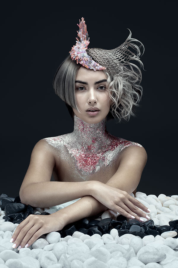 With the appearance of rough rocks, the geodes hide within them precious crystalline formations. They can go unnoticed at first glance and to find their true beauty you have to discover their interior. For this reason, these images reflect the surprising combination of the evolution from stone to gemstone, with details that make hair a luxurious, extraordinary object, which emerges before our eyes to marvel us with its vivid tones and its capricious forms as in nature.