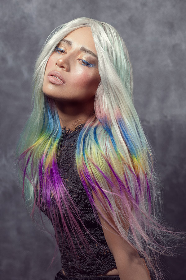 On hair, textures are combined with a strong preeminence of waves and curls that acquire even more strength with the application of the different tones. Hair simulates the softness with which algae sway with currents, the fluffiness of the most exotic bird feathers and the palette of colors that appears in the sky when the daylight fades.